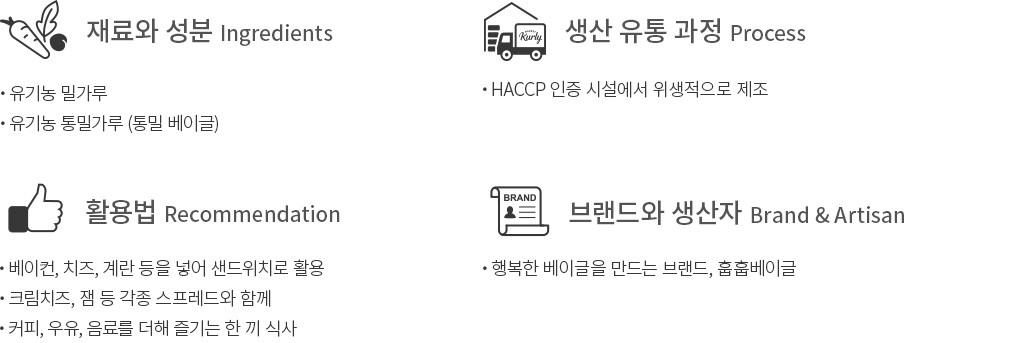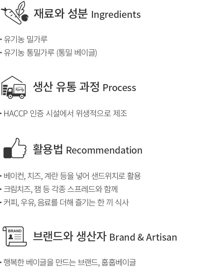 ・특징:유기농 밀가루로 깔끔하게 만든 베이글이에요. 담백하면서도 고소한 풍미를 갖췄어요.