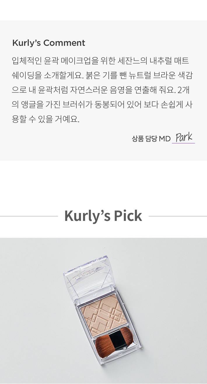 ・ 특징:모든 피부 톤에 쓸 수 있는 붉은 기를 뺀 라이트 브라운 컬러예요. 내장 브러쉬를 이용해 얼굴 가장자리 윤곽부터 좁고 세밀한 부위에 음영을 더해줄 수 있어요.