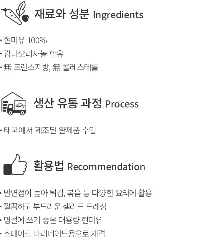 ・특징:쌀겨에서 추출한 오일만을 담아낸 현미유예요. 향미가 순하고 가벼워 두루두루 사용하기 좋아요.