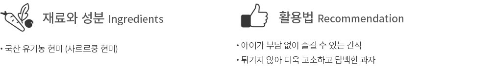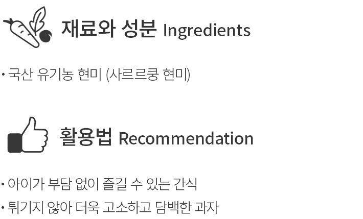 ?특징:국내산 유기농 현미에 밀크 칼슘 파우더를 더해 만들었어요. 12개월 이전 아이에게 추천해 드립니다.
