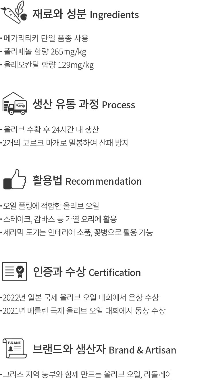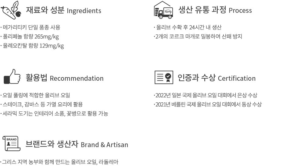 ・특징:올리브가 가지고 있는 잠재력을 최대치로 끌어올려 깊고 진한 풍미로 담아냈어요. 신선한 풀 향과 매캐하고 쌉쌀한 맛이 느껴지며,바질과 토마토를 연상시키기도 합니다.
