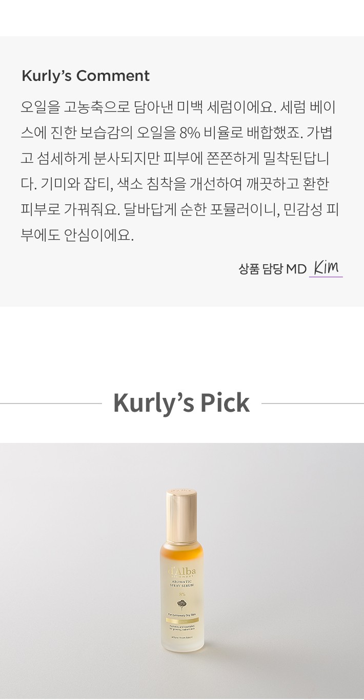 ・ 특징:오일을 8% 담아낸 미백 농축 세럼이에요. 기미와 잡티를 개선하는 기능성 제품입니다.