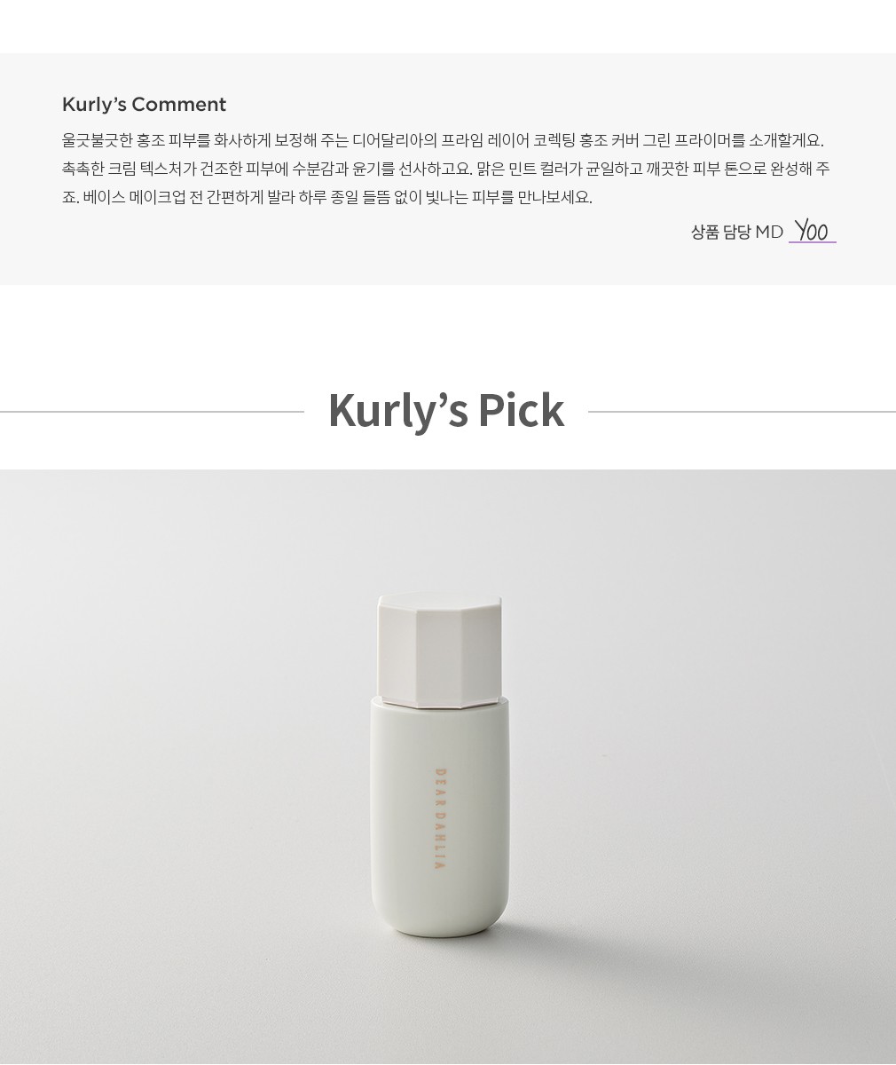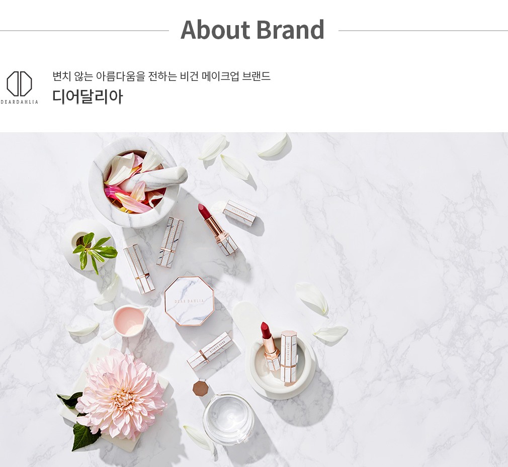 디어달리아는 달리아 꽃에서 영감을 받아 탄생한 비건 메이크업 브랜드입니다. 동물 실험을 하지 않는 것은 물론,연지벌레 등 색상을 내기 위해 들어가는 동물성 원료까지 철저하게 배제한 비건 제품을 선보이고 있어요. 또 자극이 될 수 있는 성분은 덜어내고,독자 개발한 다알리아꽃추출물을 담아 피부에 건강한 아름다움을 선사하죠. 멀리서도 한 눈에 알아볼 수 있는 디어달리아만의 팔각형 패키지와 대리석 디자인으로 세련된 감성까지 오롯이 느껴보세요.