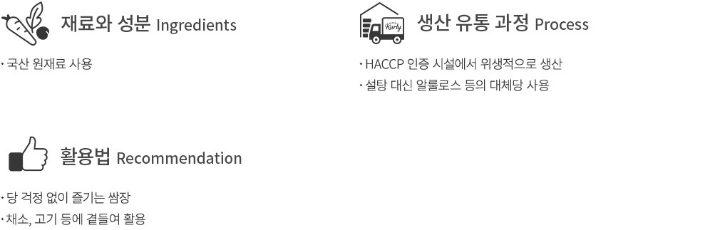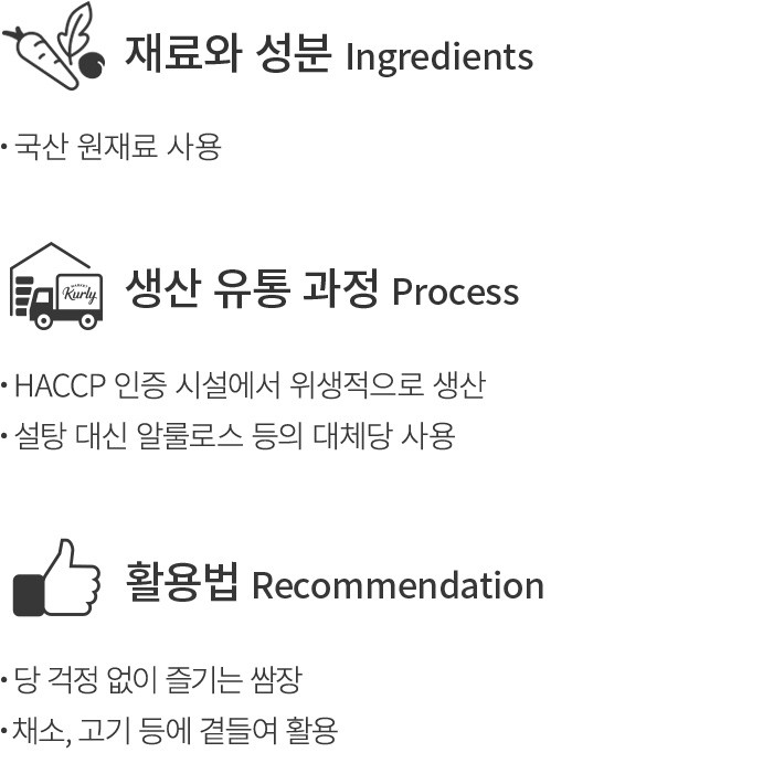 국산 원재료만을 사용해 깔끔하게 완성한 마이노멀의 쌈장을 소개할게요. 국산 된장,간장,액젓 등을 사용한 것은 물론 알룰로스를 사용해 은은한 단맛을 더했답니다. 고기,채소 등에 곁들여 즐겨보세요. 구수하면서도 매콤한 감칫맛을 즐길 수 있을 거예요.