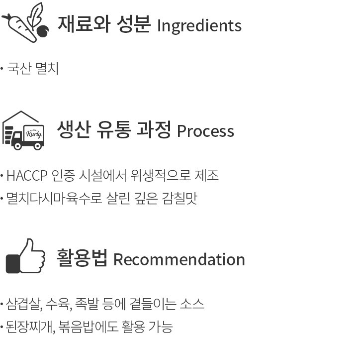 활용팁?잘 구운 삼겹살에 멜젓 소스를 찍어 드셔 보세요. 삼겹살은 물론,수육이나 족발에 곁들여도 좋답니다.