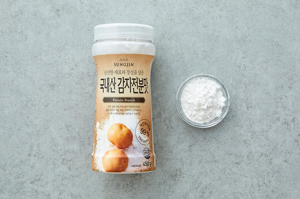 곡물류의 분말 가공 방법에 대해 특허*를 보유하여 전분 가루를 전문적으로 생산하는 성진의 국내산 감자전분맛을 만나 보세요. 감자전분은 고온에서도 끈끈한 점성을 유지하는데요. 조리하면 투명한 빛깔과 단단하고 쫀득한 질감으로 변한답니다. 용기에 담겨 있으니 언제든 편하게 사용하고 깔끔하게 보관할 수 있을 거예요.