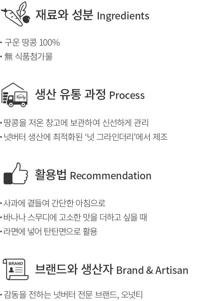 ・특징:땅콩을 오랫동안 곱게 갈아 부드러운 질감으로 완성한 오리지널 땅콩버터입니다.