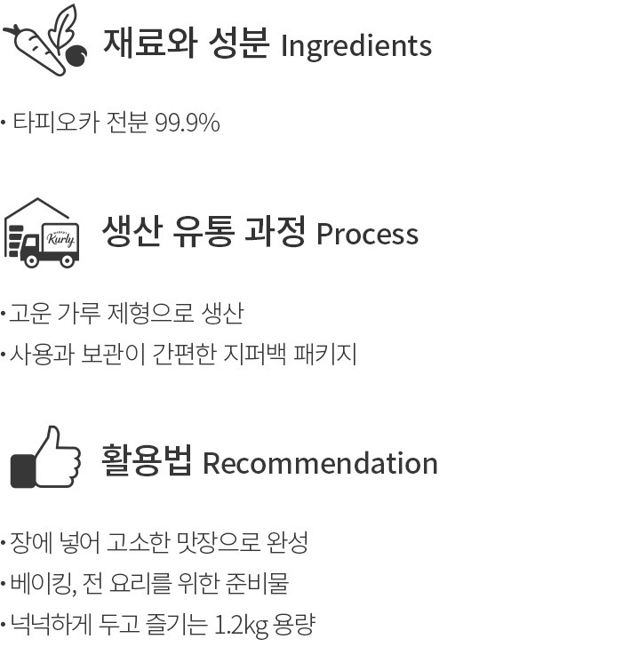 Tip. 부침 외의 요리에 사용하실 경우,밀가루와 1:1 비율로 혼용을 권장드려요. 쫄깃하면서도 완성도 높은 요리를 완성할 수 있답니다.
