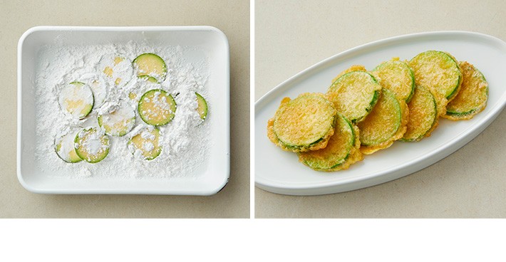 2. 타피오카 전분을 묻힌 재료를 계란물에 담근 뒤,노릇하게 부쳐 드셔 보세요.