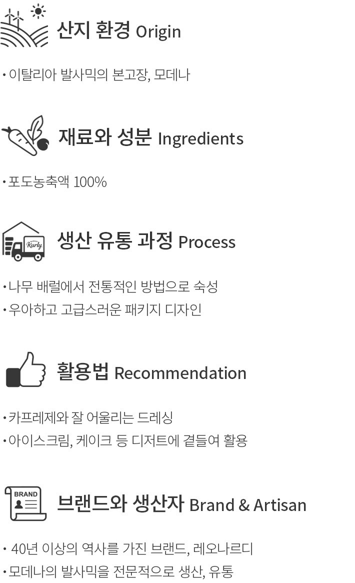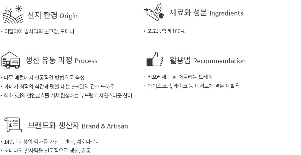 레오나르디 가문은 140년간 전통적인 숙성 기법으로 발사믹 비니거를 생산해오고 있습니다. 1871년에 설립된 이래로,4대에 걸쳐 이탈리아를 대표하는 전통 발사믹을 만든다는 자부심을 가지고 제품을 생산하고 있지요. 레오나르디 모데나 발사믹은 원래 상류층들만 즐기던 고급 식초로,‘공작의 식초’라 불리기도 할 만큼 뛰어난 품질과 차별화된 맛을 자랑합니다. 현재 미국의 고급 식료품/주방기구 판매 회사로 유명한 윌리엄 소노마의 프라이빗 라벨 발사믹을 만들어줄 정도로 그 기술력과 품질을 인정받고 있습니다.