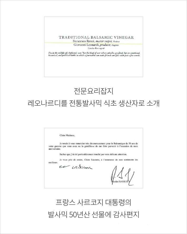격이 다른 발사믹을 만드는 레오나르디 레오나르디가 위치한 모데나에서는 전통 발사믹 식초에 ‘Aceto Balsamico Trandizionale di Modena’라는 마크를 붙여줘요. 이 마크을 얻기 위해서는 모데나 지방에서 9~10월에 수확한 포도를 사용해 전통적인 tradizionale 기법으로 식초를 만들어야 합니다. 레오나르디는 복잡하고 많은 시간이 걸리는 전통 방법을 고수하며 격이 다른 발사믹을 생산하고 있어요. 그 열정과 고집 덕분에 프랑스 사르코지 대통령에게 감사편지를 받기도 했죠.