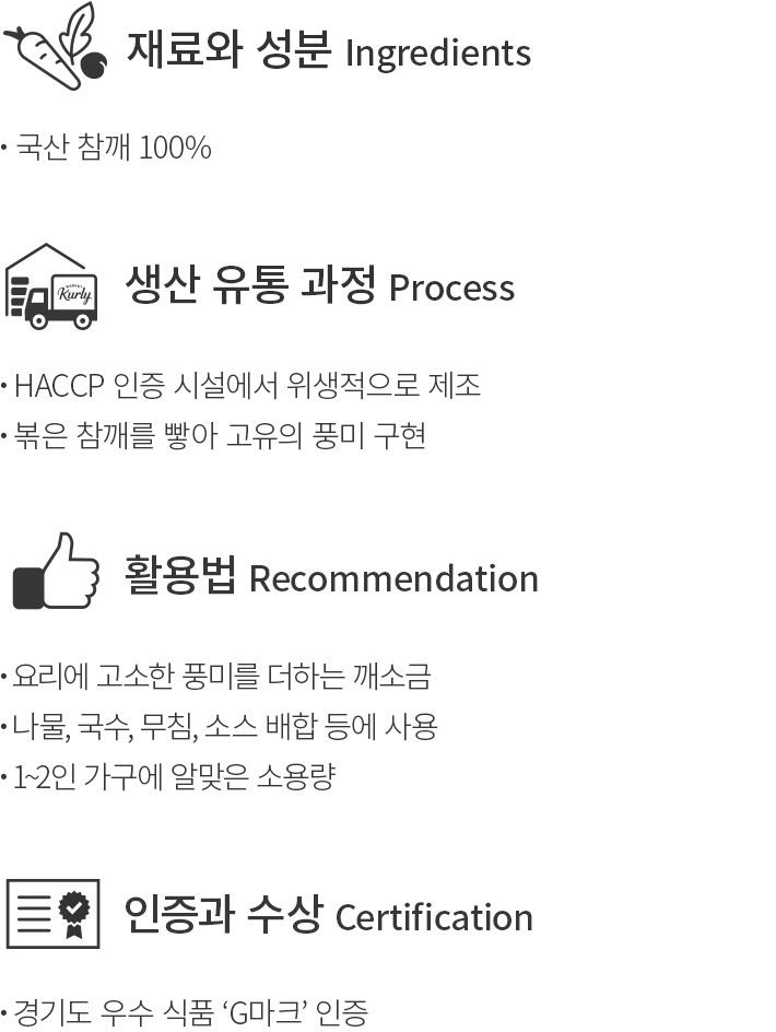 어떤 요리에든 솔솔 고소함을 더해주는 깨소금,햇님마을의 깨소금은 국산 참깨를 사용해 그 풍미가 더욱 깊어요. 저온에서 볶아 고유의 향을 그대로 보존했고요. 통깨보다 입자가 고와 다양한 메뉴에 두루두루 활용하기 좋아요. 오늘의 식탁에 고소한 맛을 톡톡 더해보세요.