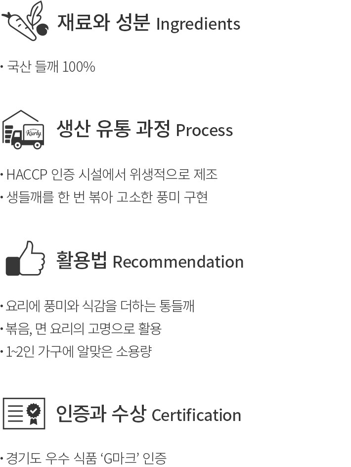 국산 들깨를 사용해 풍미가 더욱 깊은 햇님마을의 통들깨를 만나보세요. 들깨를 한 번 볶아 들깨 특유의 비린 향을 없앴고요. 생들깨보다 입 안에서 톡톡 튀는 느낌이 더욱 잘 살아 있답니다. 각종 요리에 바로 톡톡 뿌려도 좋지만,원하는 입자로 빻아서 사용해도 좋아요.