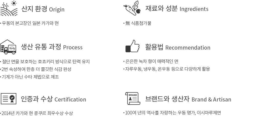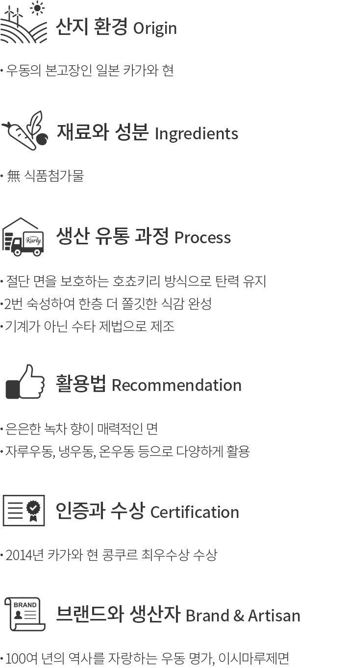우동의 본고장인 카가와 현에서 100년의 역사를 자랑하는 우동 명가,이시마루제면의 차 우동을 만나 보세요. 2번에 걸쳐 숙성했을 뿐만 아니라,수타 제법을 철저하게 고수하여 쫄깃하고 탱탱한 면발을 완성했답니다. 식감과 탄력을 제대로 유지할 수 있도록 전용 칼로 면을 절단하는 호쵸키리 방식을 사용했고요. 녹차가루로 은은한 풍미까지 더해 더욱 만족스러워요. 취향에 따라 쯔유나 가쓰오부시 국물을 곁들여 다양하게 즐겨 보세요.