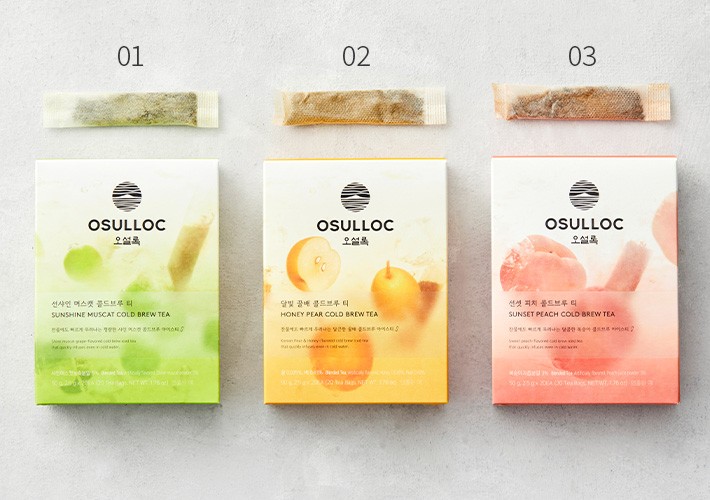 글로벌 차 브랜드,오설록이 선보이는 콜드브루 티 3종을 만나보세요. 녹차 또는 홍차와 과일농축분말을 블렌딩해 싱그러운 풍미를 자랑한답니다. 스틱형 티백이라 입구가 좁은 병에도 쉽게 넣어 우려낼 수 있죠. 선샤인인 머스캣부터 상큼한 선셋 피치까지 3가지 종류를 준비했으니 취향에 따라 골라보세요.