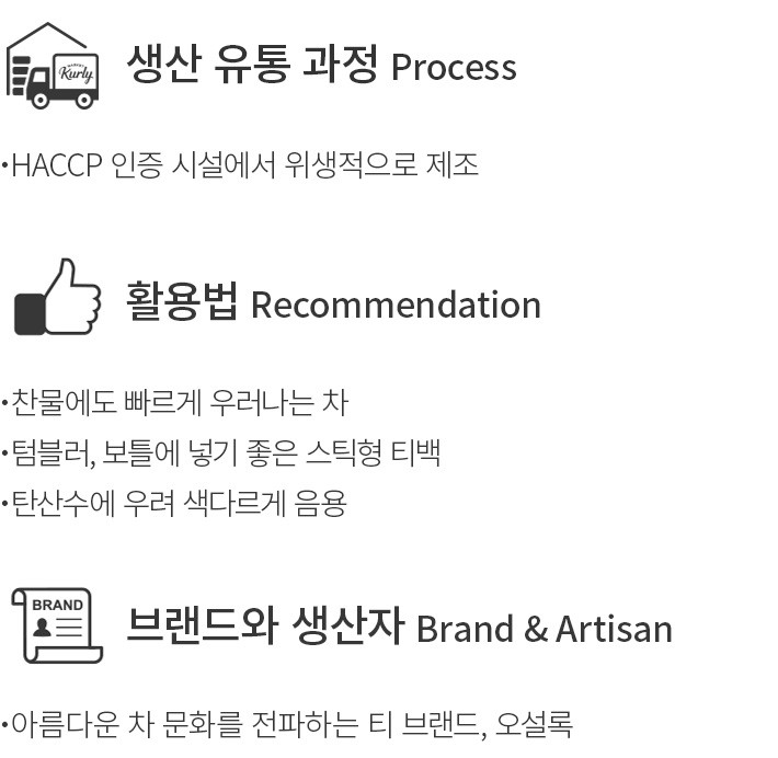 ・특징:제주산 후발효차와 녹차를 블렌딩하고 배농축혼합분말을 더해 완성했어요. 은은한 달콤함과 쌉싸름함이 조화롭게 어우러집니다.