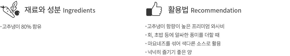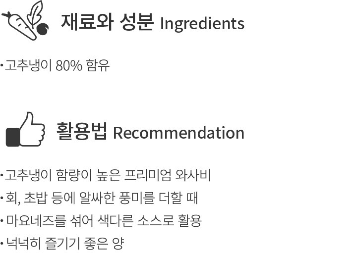 신선한 고추냉이를 80% 함유하고 있는 코우의 프리미엄 생와사비를 소개할게요. 고추냉이 특유의 알싸한 풍미와 은은한 단맛이 고스란히 담겨있답니다. 양을 넉넉히 담았을 뿐만 아니라,냉동 보관할 수 있어 더욱 만족스러워요. 회나 초밥 등에 톡 쏘는 매콤함을 더할 때 활용해 보세요. 마요네즈를 섞어 색다른 소스를 만들어 보아도 좋을 거예요.
