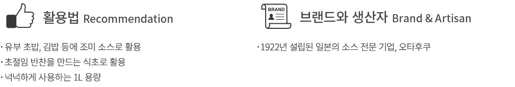 오타후쿠는 일본에서 1922년 설립된 소스 전문 기업이에요. 오타후쿠가 선보이는 초밥용 식초는 자극적인 산미 없이 부드럽고 은은하게 감기는 맛을 지녔는데요. 한 번 구비해두면 매번 초밥용 배합초를 만들 필요 없이 간편하게 활용하기 좋답니다. 넉넉한 1L 용량이니,두루두루 사용하기 좋을 거예요.