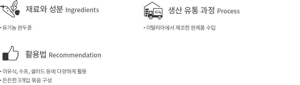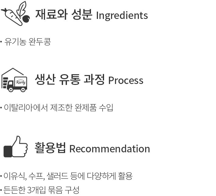 이탈리아의 유기농 식료품 전문 브랜드,일뉴트리멘토의 유기농 완두콩 캔을 소개합니다. 정성껏 재배한 유기농 완두콩에 물과 소금만을 더해 깨끗하게 완성했어요. 완두콩 본연의 담백한 맛과 부드럽게 톡 터지는 식감이 잘 살아있답니다. 그대로 드시거나 샐러드,수프 등에 넣어 활용해 보세요.