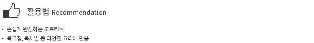 도토리묵을 직접 만들어 먹고 싶다면,지금 소개하는 도토리묵 가루에 주목하세요. 도토리 전분에 약간의 소금만 더해 깔끔하게 완성했답니다. 곡물류 분말 가공 방법에 대해 특허*를 보유한 성진에서 만든 제품이에요. 가루와 물을 섞어 끓여준 다음,냉장고에서 굳히기만 하면 금세 완성되죠. 완성된 도토리묵은 묵무침,묵사발 등으로 다양하게 즐겨 보세요.
