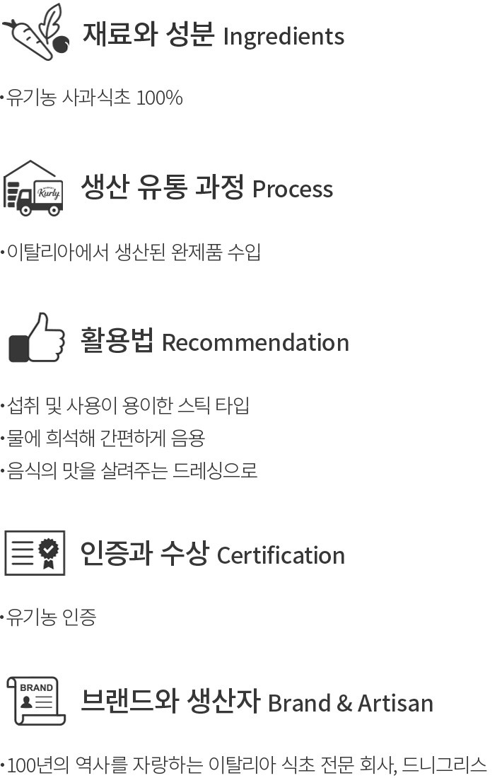 첨가물 없이 오직 사과만을 숙성 및 발효시킨 드니그리스의 유기농 사과식초를 더욱 간편하게 즐겨보세요. 한번에 희석하기 좋은 양만큼 담아 스틱 타입으로 완성한 제품이랍니다. 초모가 살아있는 것은 물론,유기농 인증을 받아 더욱 만족스러워요. 물에 희석해 드시거나 샐러드 드레싱으로도 활용해 보세요.