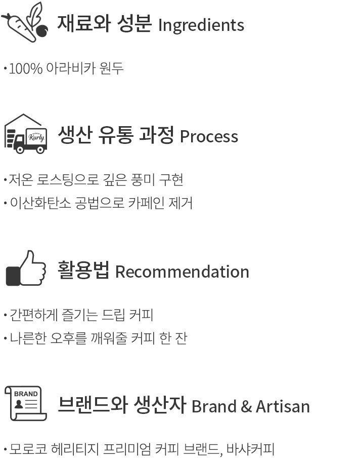 모로코 헤리티지 프리미엄 커피 브랜드,바샤커피의 디카페인 커피 드립백을 소개할게요. 이산화탄소 공법으로 카페인을 최대한 제거해,언제든 부담 없이 즐길 수 있는 커피랍니다. 아라비카 원두 본연의 풍미는 오롯이 유지했으니,늦은 오후에도 편안하게 즐겨보세요.