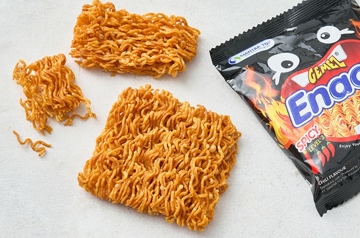 게메즈의 에낙 라면스낵 스파이시는 꼬불꼬불한 면을 오도독 씹으면 고소한 치킨 향과 함께 매콤한 맛이 느껴져 더 매력적인 라면 스낵이랍니다. '에낙'은 인도네시아어로 '맛있다'라는 뜻인데요. 이름처럼 계속 손을 부르는 마성을 가졌어요. 면 자체에 간이 되어있어 시즈닝을 뿌려 먹는 타입처럼 가루가 날리지 않아 깔끔한 것도 좋죠. 입이 심심할 때 간식으로 드시거나 맥주와 함께 안주로 즐겨 보세요.