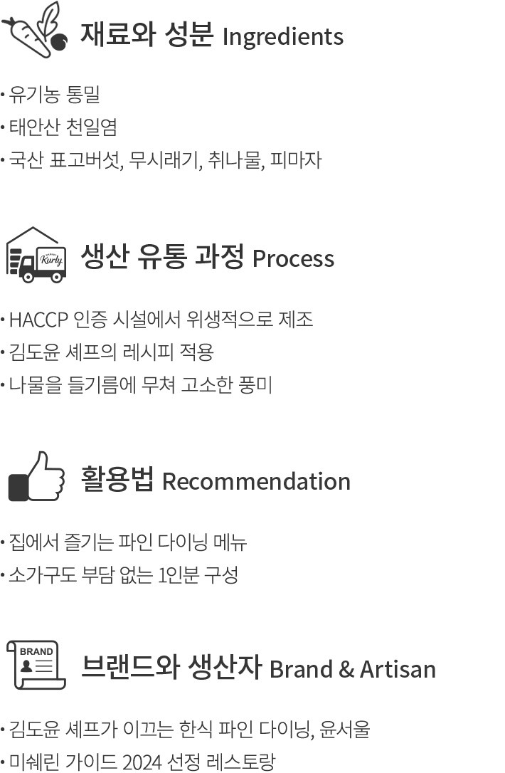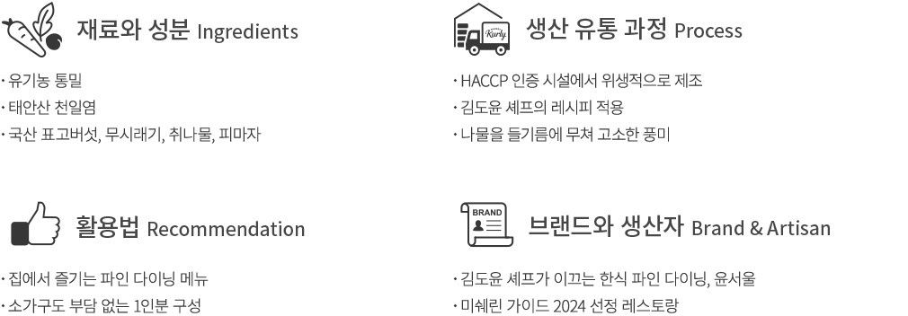윤서울은 익숙한 메뉴에 과감한 시도를 한 스푼 더한 색다른 한식을 선보이는 파인 다이닝입니다. 사계절이 주는 기다림이 곧 한국의 맛이라고 설명하는 김도윤 세프의 철학에 맞게,제철 식재료 본연의 맛을 살린 레시피를 전개하고 있습니다. 고급스러운 한식에서 벗어나 윤서울이 새롭게 정의하는 한식의 매력,이제 컬리에서 경험해 보세요.