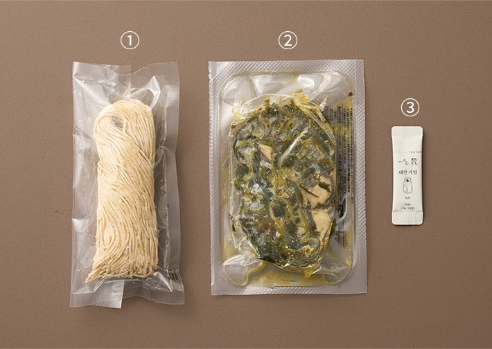 모둠나물면・구성:①통밀면(130g),②모둠나물(120g),③태안자염(1.3g)