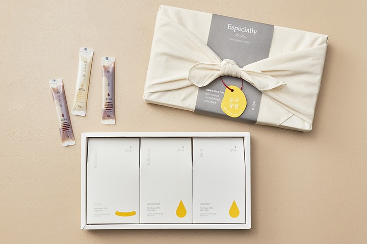 탄소동위원소비가 -23.5‰보다 낮으면 천연 벌꿀이라고 할 수 있는데요. 경북 예천에서 생산하는 꿀마실의 스틱 꿀은 모두 탄소동위원소비가 -23.5‰보다 낮은 천연 벌꿀로 구성되어 있답니다. 가볍고 달콤한 아카시아 꿀부터 진한 풍미와 쌉쌀한 맛이 매력적인 밤꿀까지,3가지 종류를 함께 담았어요. 보자기에 깔끔하게 포장하여 보내드리니,마음을 전하는 선물로 선택해 보세요.