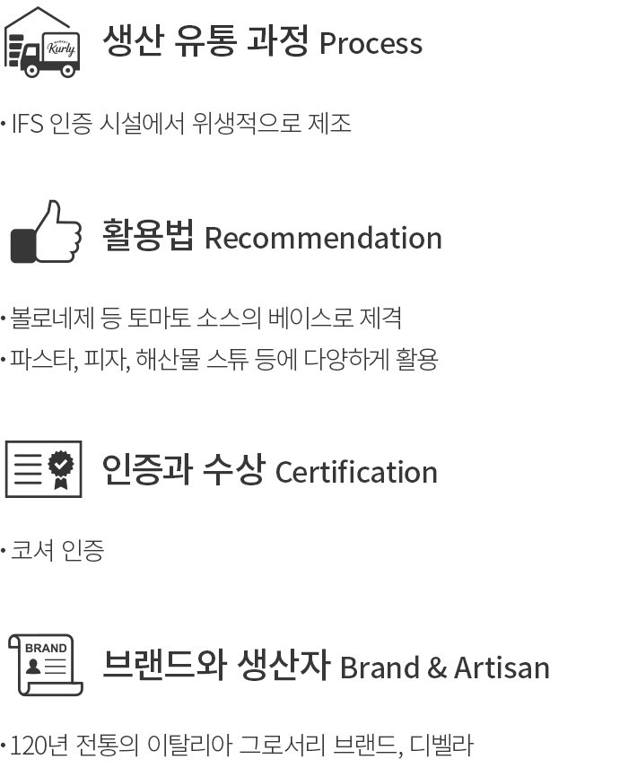 이탈리아의 강렬한 햇빛을 받고 자란 토마토로 만든 디벨라의 홀토마토를 만나 보세요. 껍질을 깐 토마토를 토마토 주스에 그대로 담아,토마토 본연의 진한 풍미와 감칠맛이 제대로 살아있답니다. 파스타,피자,스프 등으로 다양하게 요리해 보세요. 제육볶음에 넣으면 산뜻하고 깔끔한 맛을 더해줄 거예요.