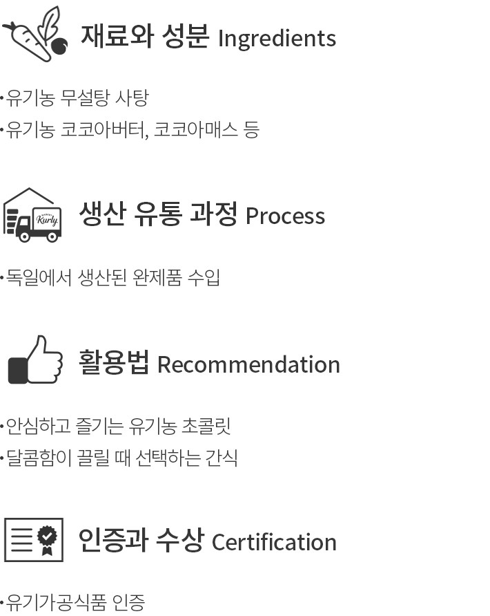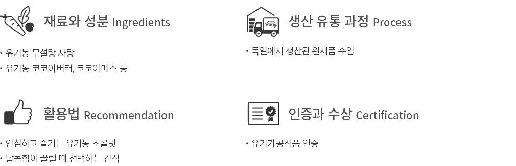 ・특징:유기농 코코아매스,코코아버터 등을 사용해 깔끔하게 완성한 초콜릿입니다. 진하고 부드러운 달콤함이 돋보여요.