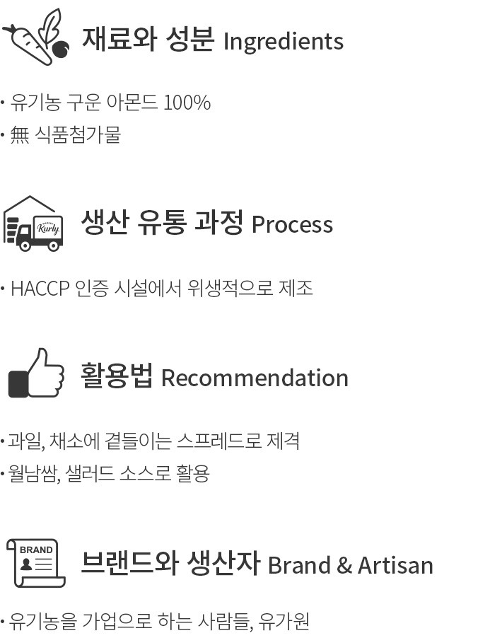 발라 먹고 찍어 먹는 스프레드 하나만 있으면,식탁이 한층 풍요로워지죠. 지금 소개하는 스프레드는 유기농 아몬드로 만든 구수한 스프레드입니다. 신선한 유기농 아몬드 외에는 그 어떠한 재료도 섞이지 않은 만큼,진하게 응축된 아몬드의 향긋함이 남다르답니다. 짙은 고소함이 밀도 있게 전해지니,수분기 있는 사과,바나나 등의 과채와 곁들여 즐겨 보세요.