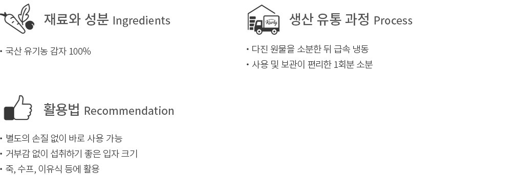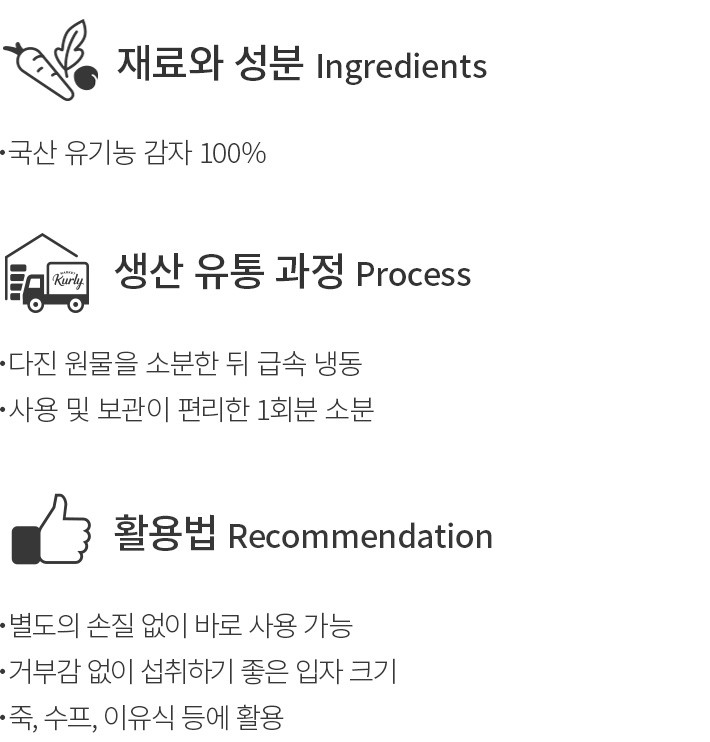 맛과 식감을 더해주는 이유식용 채소,번거로운 손질 과정 없이 간편하게 만나보세요. 깨끗하게 기른 유기농 감자를 곱게 다진 뒤 한 번에 쓰기 좋게끔 담았습니다. 깔끔한 큐브 형태로 소분했으니,한 개씩 톡 꺼내 손쉽게 요리해 보세요. 특유의 담백함과 부드러운 식감이 고스란히 전해질 거예요.