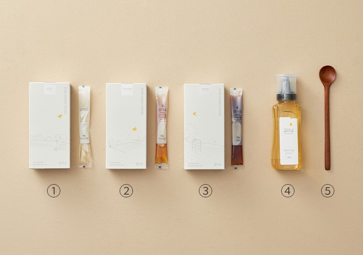 아카시아 야생화 밤꿀 스틱 &튜브꿀 선물세트・ 구성:①아카시아꿀 미니스틱,②야생화꿀 미니스틱,③밤꿀 미니스틱,④아카시아꿀,⑤우드 스푼