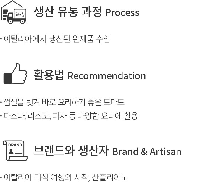 싱그러운 토마토의 풍미를 오롯이 담은 산줄리아노의 토마토홀을 소개할게요. 육질이 두껍고 당도와 산도가 적절한 조화를 이루는 토마토를 사용해 다양한 요리에 맛을 내기 수월한 제품이에요. 깔끔히 손질해 한 캔에 담아 보내드리니,파스타,피자,리조또 등 이탈리안 요리에 두루두루 활용해 보세요.