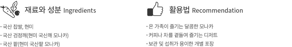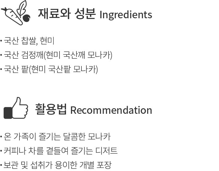 ?특징 :부드럽고 찰진 과자 속에 국산 검정깨 앙금을 채워 만든 모나카입니다. 진한 고소함이 은은한 단맛과 잘 어우러져요.