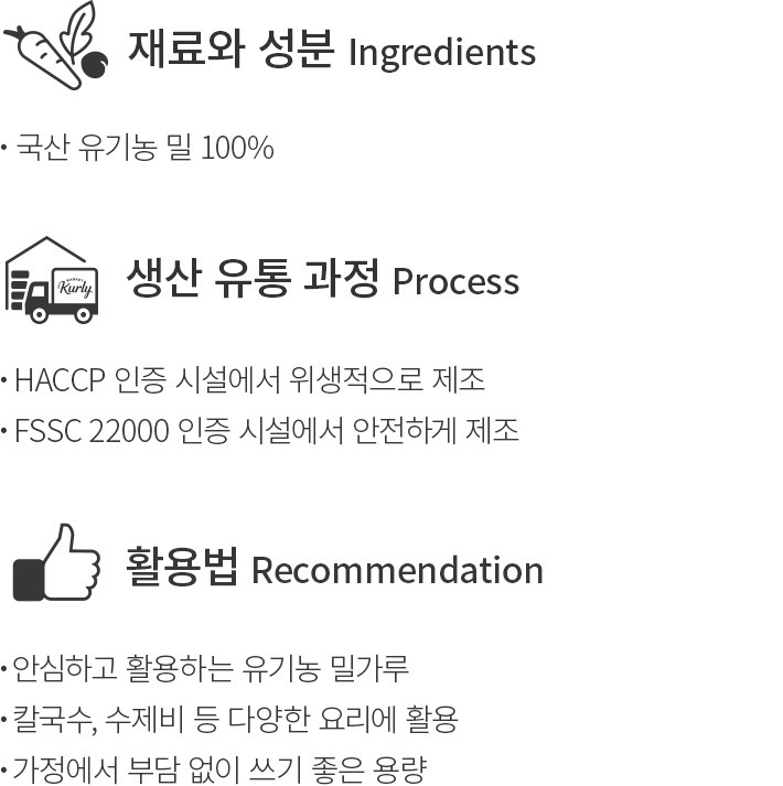 오직 국산 유기농 밀로 정성껏 만든 오가닉스토리의 유기 밀가루를 소개합니다. 농약이나 비료 등 화학 자재를 사용하지 않고 재배한 밀을 꼼꼼한 제조 과정을 거쳐 곱게 갈아 한 봉에 담았답니다. 국수,만두,수제비 등 다양하게 쓰이는 밀가루를 더욱 안심하고 즐겨 보세요.