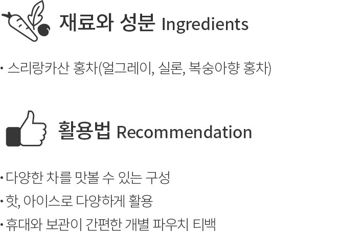 ・특징:스리랑카산 홍차에 얼그레이향을 더해 완성했어요. 상큼하면서도 진한 향미가 돋보입니다.