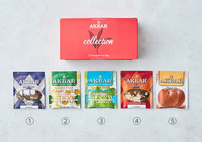 컬렉션・구성:①얼그레이 홍차,②캐모마일 허브차,③페퍼민트 허브차,④실론 홍차. ⑤복숭아향 홍차