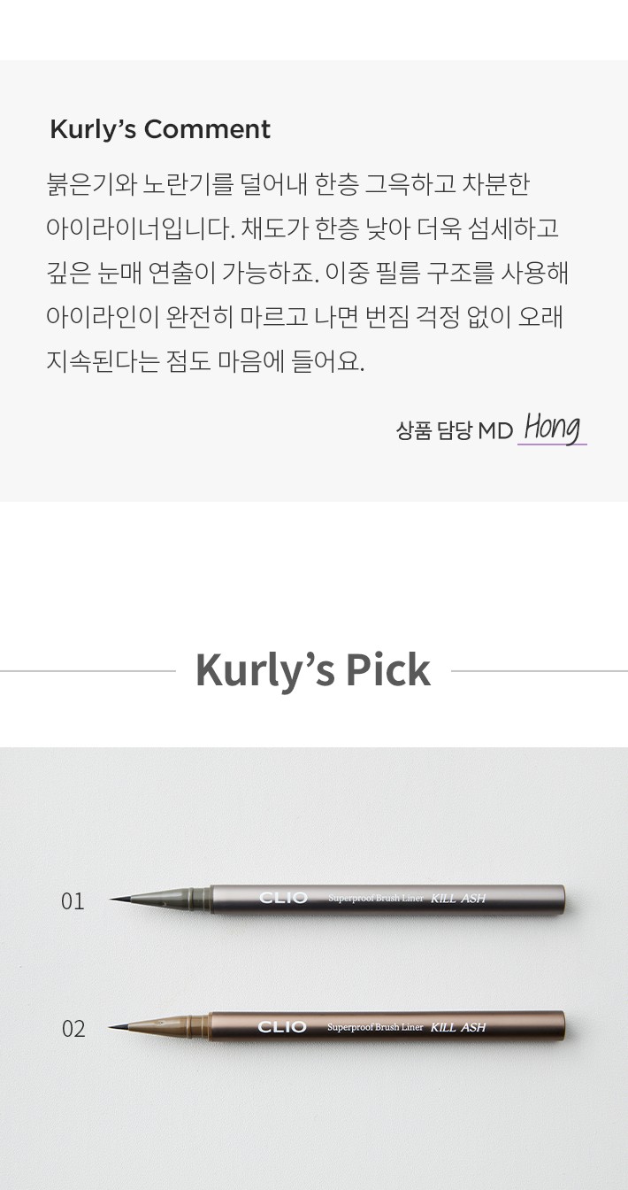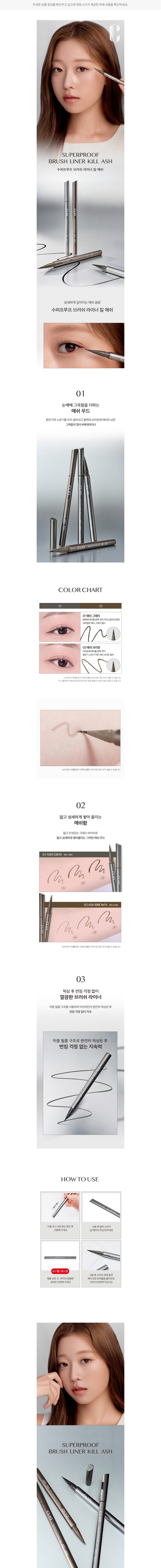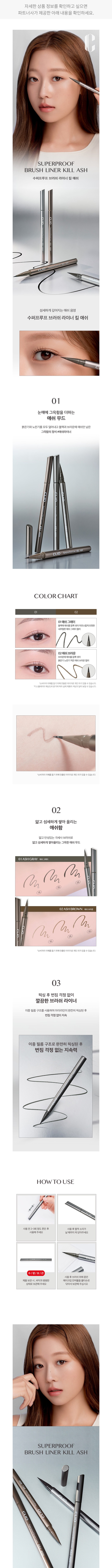 01. 수퍼프루프 브러쉬 라이너 킬애쉬 애쉬그레이・ 중량 :1개(0.14g) ・ 특징 :붉은기나 노란기 없이 차분하면서도 또렷한 느낌을 주는 애쉬그레이 컬러입니다.