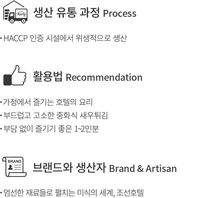 조선호텔의 중식당,홍연의 대표 메뉴인 크림새우를 이제 집에서 손쉽게 즐겨보세요. 호텔 쉐프의 노하우로 통통한 새우에 얇은 튀김옷을 입혀 바삭하면서도 탱글하게 튀겨냈어요. 녹진한 마요네즈에 상큼한 레몬을 더해 마지막 한 입까지 깔끔하게 즐길 수 있답니다. 새우튀김과 소스를 가볍게 버무려 호텔 중화요리를 완성해 보세요.