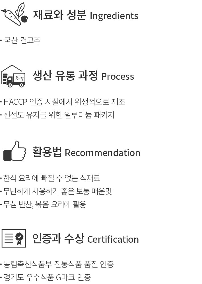 ・특징:국산 건고추 중 품질이 좋은 원물만 선별하여 곱게 빻아 만든 고춧가루입니다.
