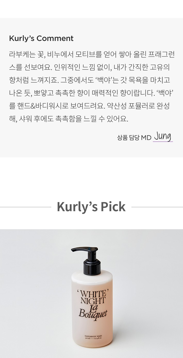 ・ 특징:샤워 후에도 촉촉함을 느낄 수 있는 약산성 핸드&바디워시입니다. 뽀얗게 수증기 핀 욕실에서 맡는 듯,촉촉하고 나른한 비누 향이에요.