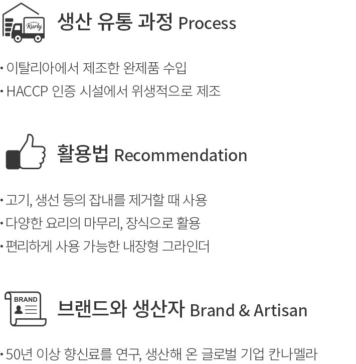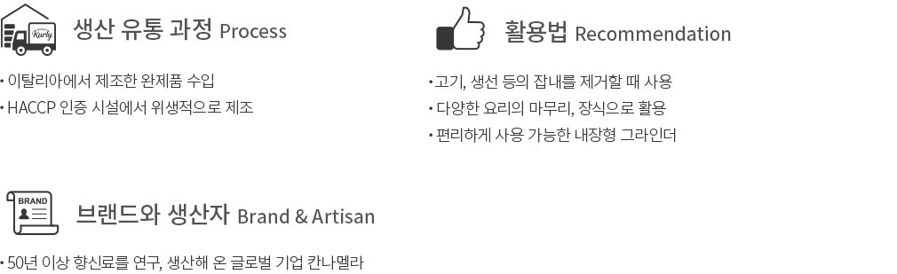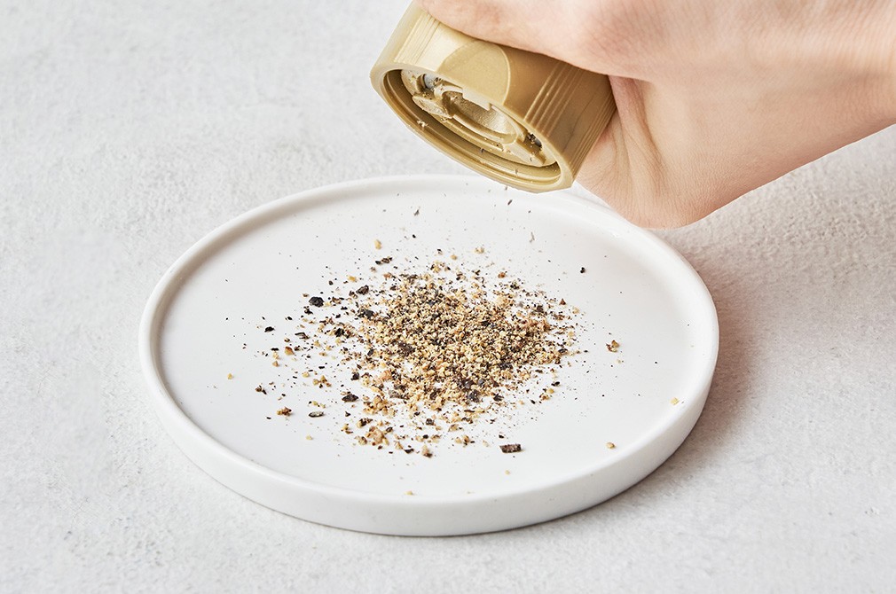 유기농으로 정성껏 재배해 한 병에 담은 칸나멜라의 흑후추를 소개합니다. 틈틈히 씹히는 입자에 신선한 후추향과 깔끔한 매운맛이 고스란히 담겨 있죠. 내장된 그라인더로 필요할 때 바로 갈아 사용할 수 있어 편리함은 말할 것도 없답니다. 고기나 생선의 잡내 제거는 물론,요리에 알싸한 매력을 더해보세요.