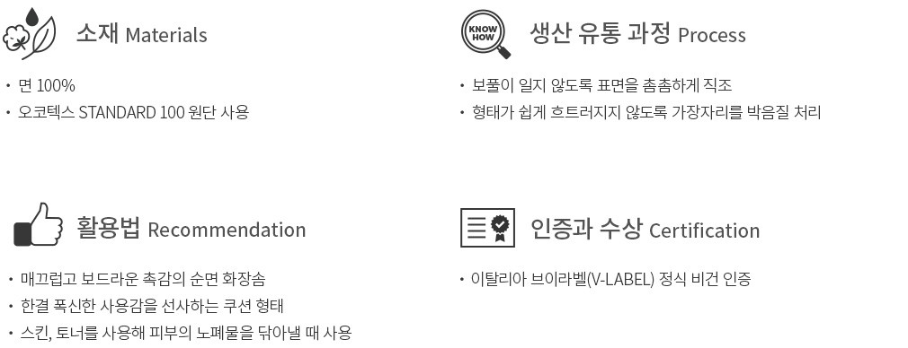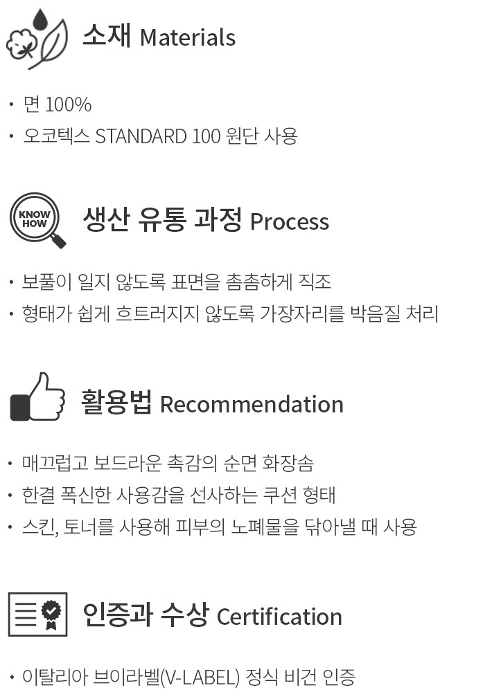 ・ 특징:오코텍스 인증을 받은 원단으로 완성한 면 100% 화장솜입니다. 촘촘하고 매끄러운 표면이 힘 있게 노폐물을 걷어내고,폭신한 촉감은 피부에 닿는 자극을 줄여줍니다.