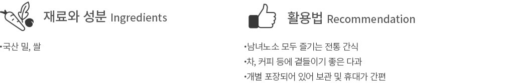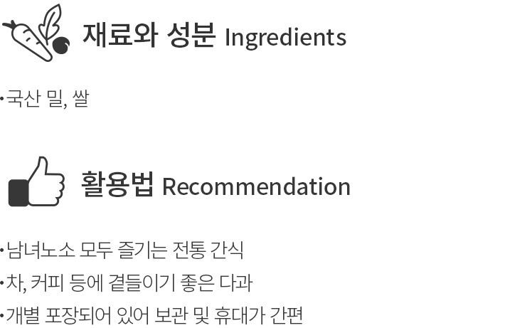 ?특징:국산 밀로 만든 한입 크기의 약과예요. 조청 쌀엿으로 자연스러운 단맛을 더했어요.