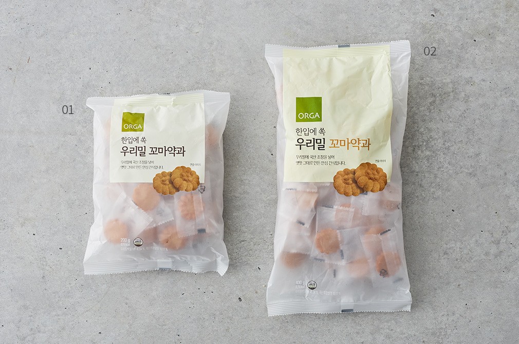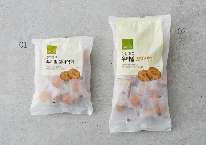 01~02. 한입에 쏙 들어오는 우리밀 꼬마약과?선택 가이드:①1봉(200g),②1봉(400g) 중 선택하세요.