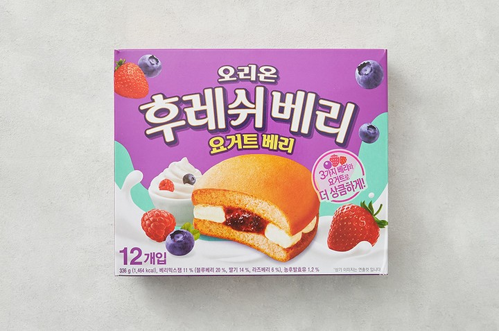 새콤달콤한 필링이 매력적인 오리온의 후레쉬베리 요거트베리를 소개할게요. 폭신한 케이크 시트 속을 딸기,라즈베리,블루베리 잼으로 상큼하게 채웠어요. 요거트 향을 더해 산뜻함까지 느껴져요. 커피나 우유와 함께 간식으로 즐겨보세요.