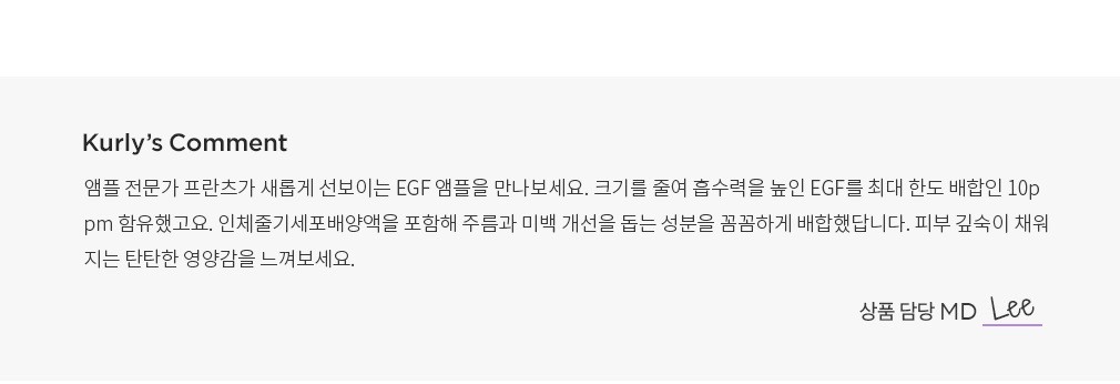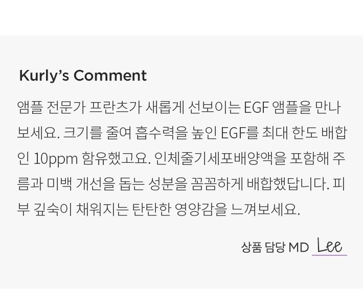 ? 특징:EGF와 인체줄기세포배양액을 함유한 고농축 영양 앰플입니다. 피부 깊숙이 탄탄한 힘과 광채를 채워줘요.